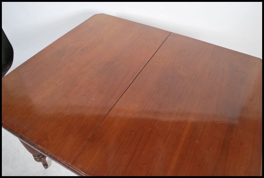 A Victorian extending pull out dining table together with an additional leaf. The table being raised on castors with reeded leg and pull out extending frieze frame. Measures: 74cm high x 124cm wide x 104cm deep.