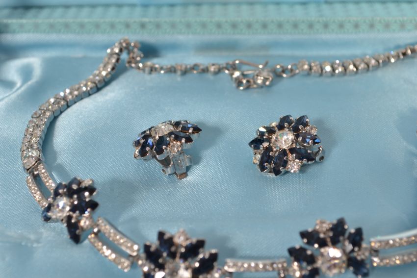 A 1950's blue and white rhinestone set necklace and earring set in presentation box. The necklace having a hook clasp the earrings having clip backs. Measures necklace 16.5 inches
