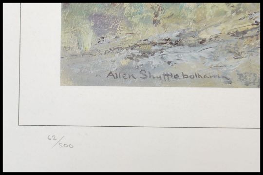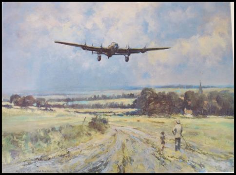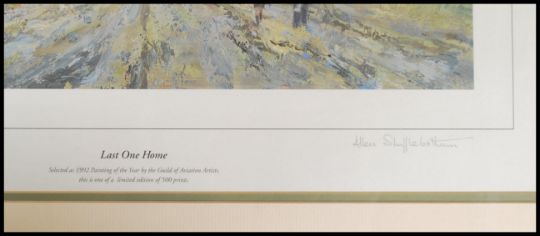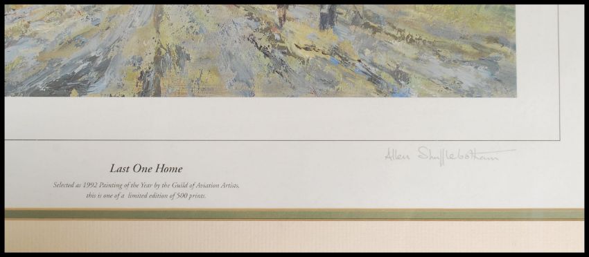 After Allen Shuttle Bolham. A framed and glazed print being limited edition entitled ' Last One Home ' 62 / 500 signed in pencil to the artist. Country scene in WW2 depicting a landing Lancaster bomber returning from mission