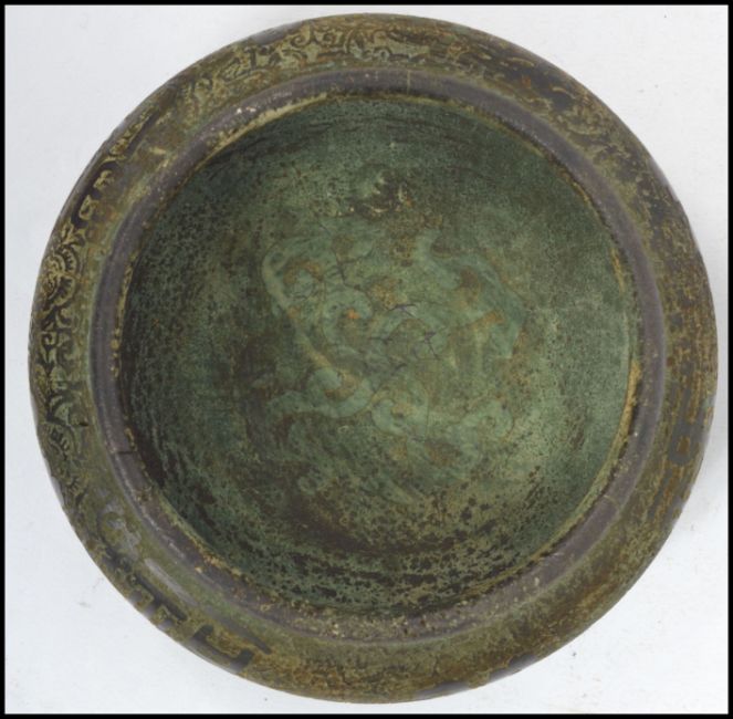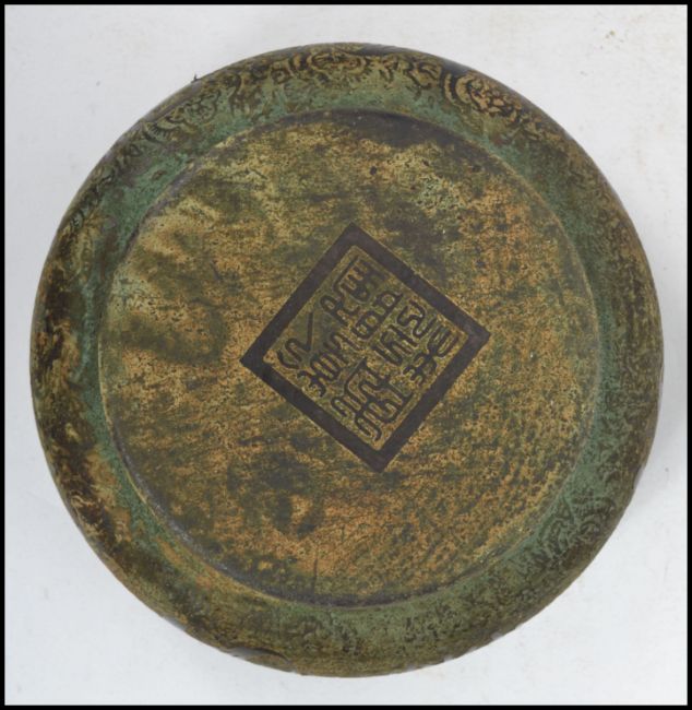 A 19th century Oriental Chinese bowl of squat form having decorative symbols and characters, with character marks to base. Measurements: 6 cm high and 15 cm diameter.