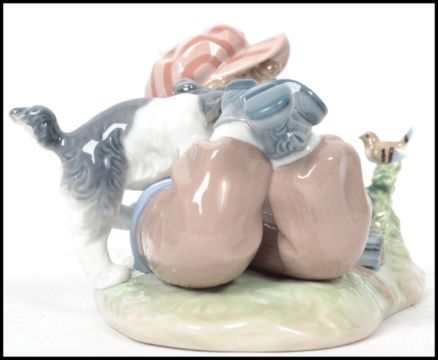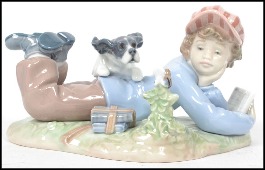 A Lladro ceramic figure titled " Study Buddies "  No. 05451 modelled as a slumbering student with it's dog on their back. Measures: 9cm high x 16cm deep x 19cm wide.