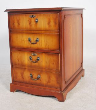 A Georgian style yew wood 2 drawer filing cabinet. Raised on plinth base with twin drawers having a tooled leather top, brass handles to the drawers