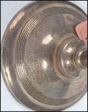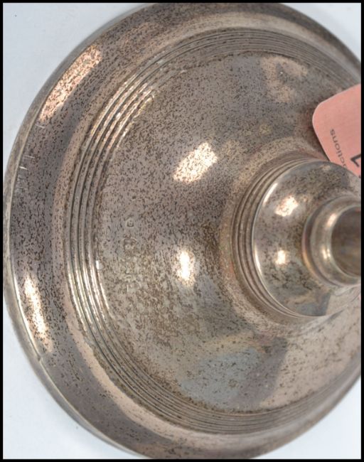 A collection of silver items to include a cranberry glass silver collared scent bottle, napkin rings, candle stick and a hand held mirror. Candlestick measures 16 cm high and the mirror measures 24 cm long.