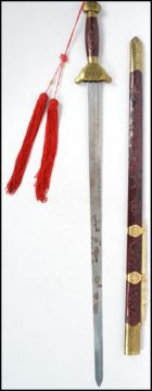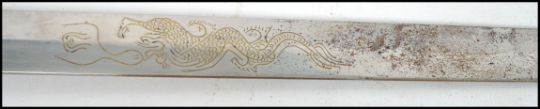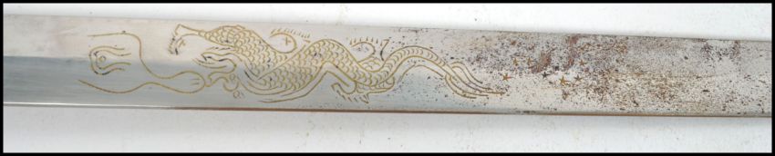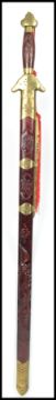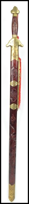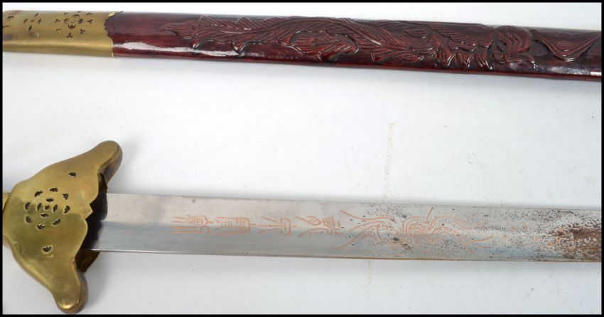 A 20th century Oriental decorative dress sword of large form having carved wooden handle with brass bound sheath. Measures:  98cm long.