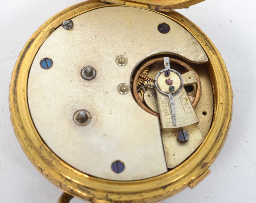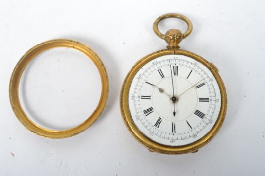 A large oversized doctor's pocket watch in yellow metal chase decorated pocket watch having heart rate rim dial around the roman numeral chapter ring. The case and key wind movement unsigned with serial number. Bale atop
