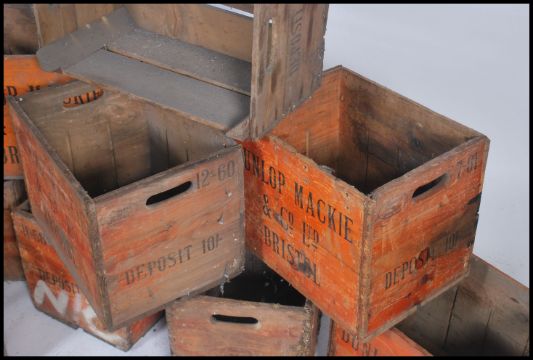 A collection of ten vintage retro beer / ale transportation / advertising stacking cases, each case with notation to the side to include Dunlop McKie, Charlton etc