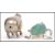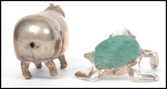 A silver novelty pin cushion in the form of a frog with green baize cushion atop along with a brass miniature pig. Measures 5cms long.