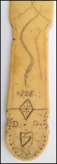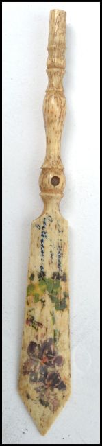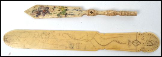 A Georgian 19th century ivory carved page turner having an inscribed date 1826 having chase decoration. Together with an ivory / bone stanhope. Longest measures 19 cm.