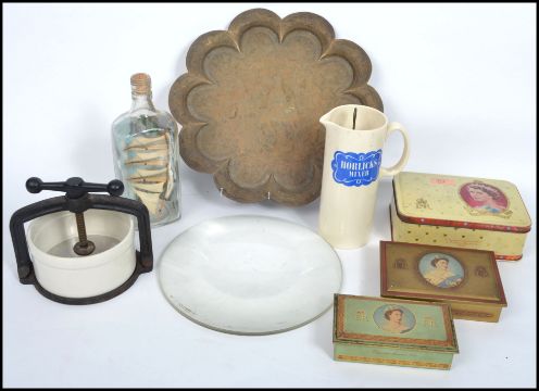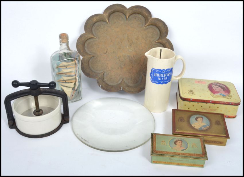 A collection of curios to include a Tongue / Cheese press, a Horlicks Mixer, a large early 20th century optic, 19th century Anglo Indian brass charger etc. Measures: 6cm highest x 14cm deepest x 20cm widest.