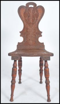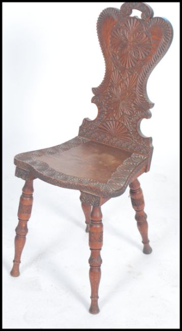 A late 19th / early 20th century  oak hall chair with a shield armorial shape back rest, panel seat on turned tapering legs.  Measures 92cms by 42cms by 42cms.
