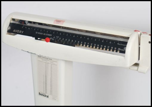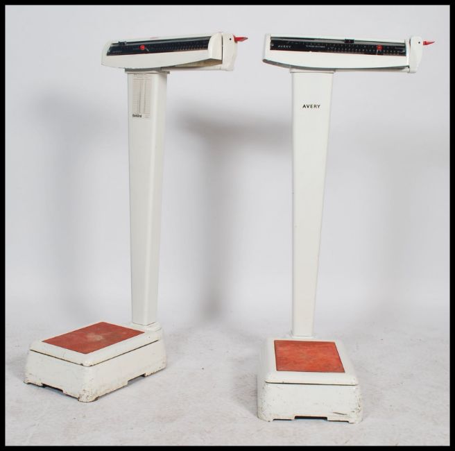 A pair of large 20th century Industrial / medical doctors weighing scales complete with original white enamel finish, horizontal gauges with step platform bases. Measures: 117cm high.