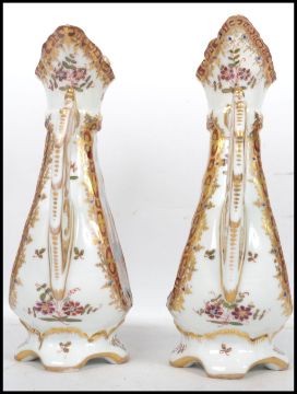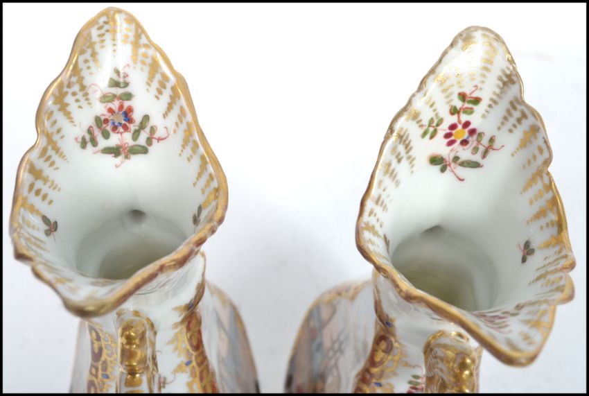 A pair of 19th century Dresden twin handled ceramic vases having a white ground with painted scenes of castles and boats with gilt detailing with flared rims. Blue Crown Dresden marks to base. Measurements: 22 cm high, 14 cm wide and 8 cm deep.