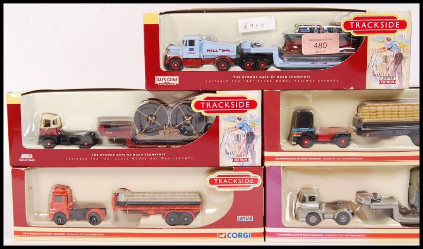 A collection of 5x original Lledo Days Gone Trackside diecast model sets to include; DG110004 Scammell with boat, DG186013 ERF Flatbed/ trailer, DG15001 Foden S21 Low Loader, DG186012 ERF LV Platform Trailer & DG175008 Scammell Handyman Low Loader. All within their original boxes.