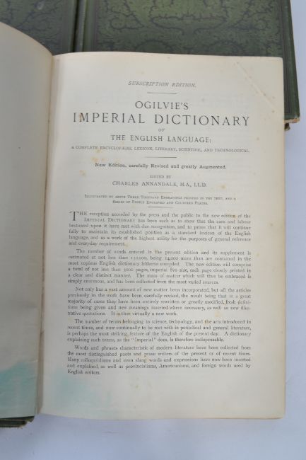THE IMPERIAL DICTIONARY OF THE ENGLISH LANGUAGE c1896 Subscribers' edition. EIGHT Volume set. "A complete encyclopedic lexicon literary scientific and technological". Publisher: Blackie & Son. Large format, green hardback with gilt lettering.3,000+ in-text illustrations plus full colour & engraved plates. An amazing publication.