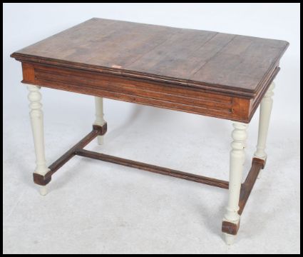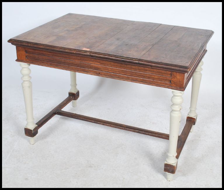 A  19th centuryFrench oak extending shabby chic painted country dining table . Raised on turned legs united by stretchers with rectangular table top with leaves. Similar chairs in lot 1400