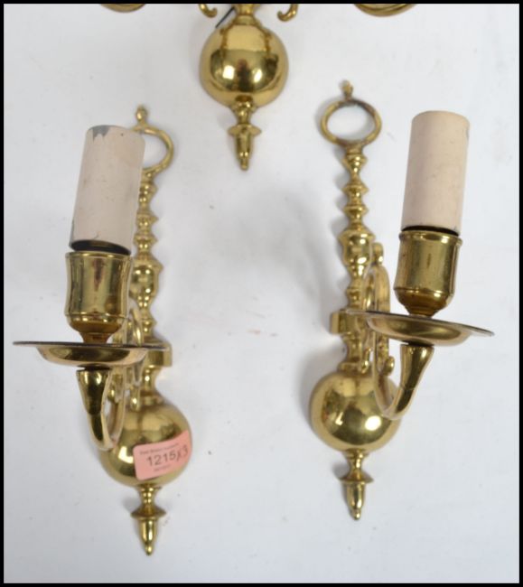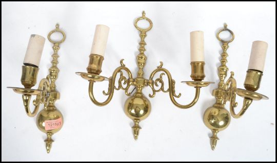 A set of three cast brass early 20th century scrolled wall sconces in the 17th century Dutch style. Measures 28 cm high and 27 cm wide.