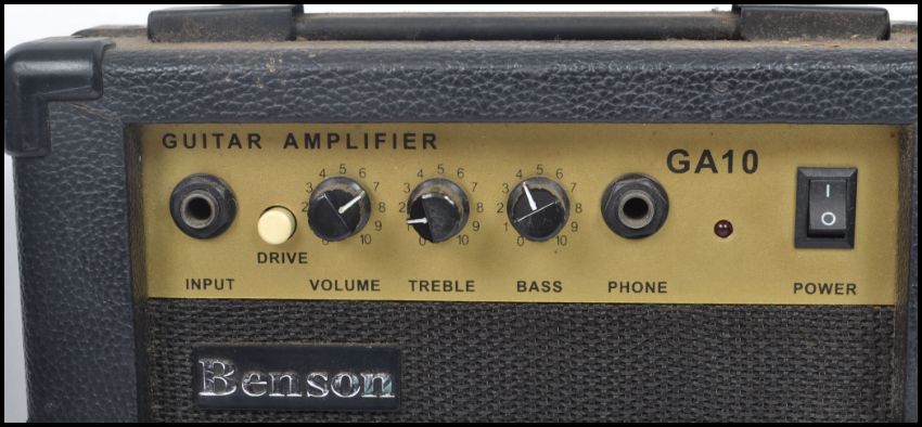 A vintage Benson electric six string guitar having a sprayed fading red body with white scratch guard with Benson amp.