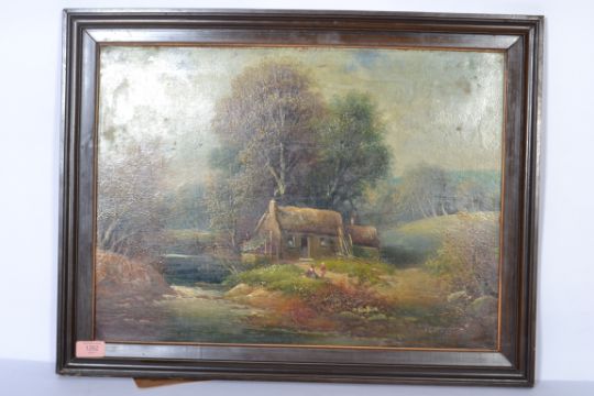 Local interest GEORGE HARRIS (British, 1858-1881), a framed oil on canvas painting of a mill cottage on the river possibly near Snuff Mills with figures sat on the river bank signed to corner.