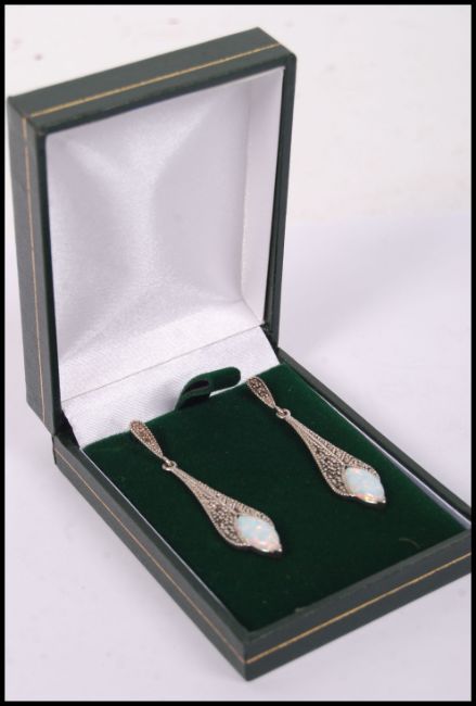 A pair of silver and marcasite art deco style drop earrings with post backs.