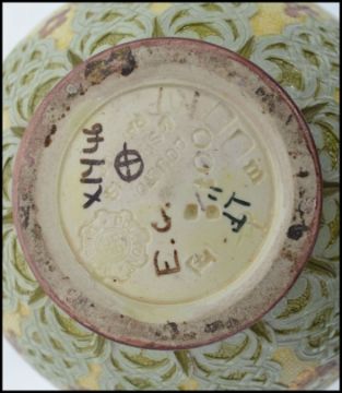 A Doulton Slaters Patent stoneware Art Nouveau ewer jug - vase having stunning design over yellow ground being stamped to the base with further initials and markings including EG believed to be artist Nellie Garbett. Measures 26 cm high, 12 cm wide and 13 cm deep.
