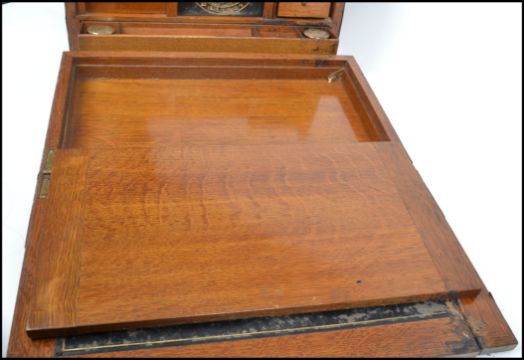 A very good early 20th century  Edwardian oak metamorphic desk tidy / stationery box. Pull action revealing hinged top with fully appointed interior. Measurements: 28 cm high, 42 cm wide and 23 cm deep.
