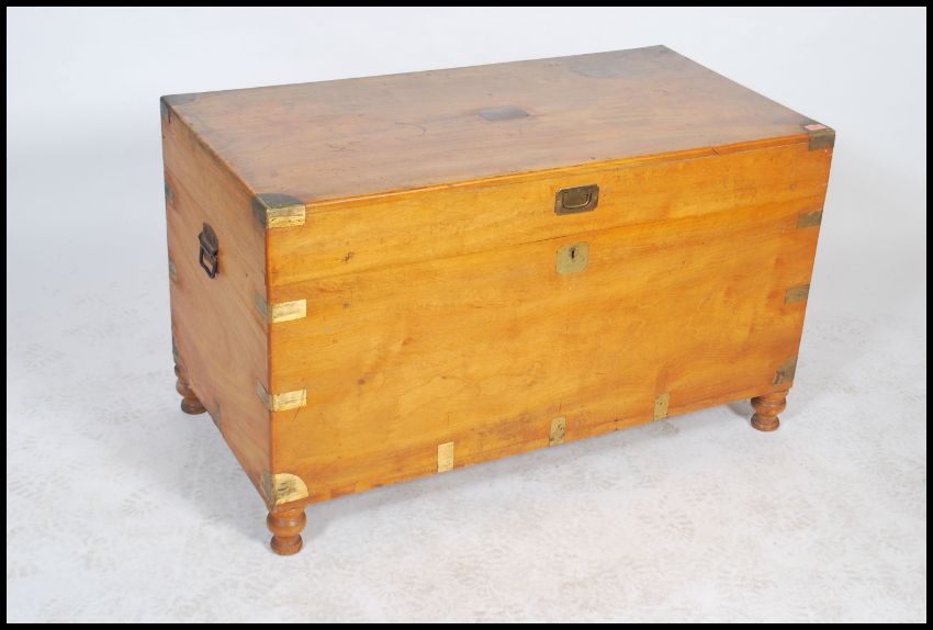 19th Century camphor wood trunk with brass and wooden bandings and iron end handles. Measures: 86cm high x 112cm wide x 59cm deep.
