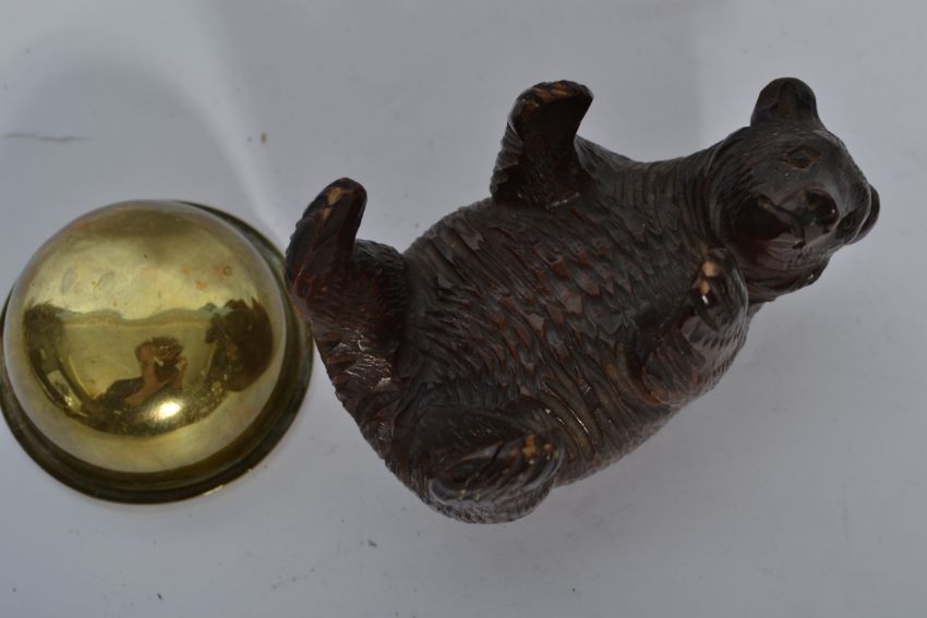An early 20th carved oak blackforest / black forest bear carved in a reclined position with glass eyes holding a simple brass bowl.