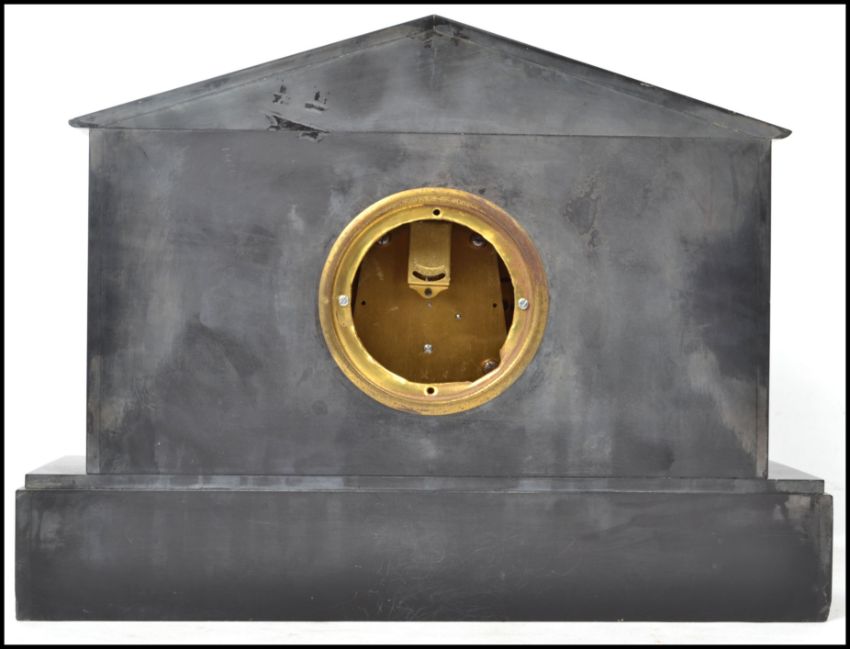 An early 20th century black marble slate mantel clock, raised on a block plinth with columned supports and sloped top, the silvered dial having an Arabic numeral chapter ring with faceted hands. Measures:  32cm high x 17cm deep x 43cm wide.