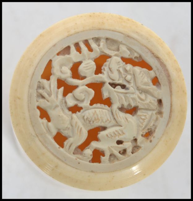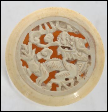 A 19th century Oriental ivory cricket catcher pot box of cylindrical form having Geisha decoration with pierced dragon lid. Measures 7cms high.