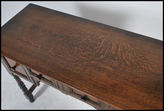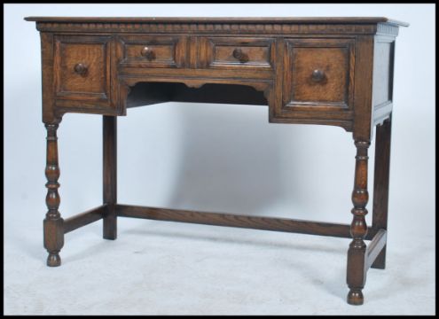 A 20th century Jacobean revival writing table - side table desk being raised on cup and cover legs with peripheral stretchers having three drawers with geometric panelled facia