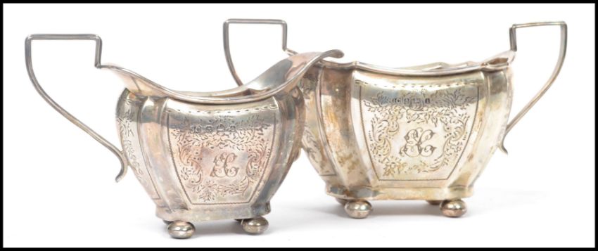 A silver hallmarked creamer jug and matching sugar bowl, decorated with chase decorated fauna design. Birmingham assay mark, dating to 1908, makers marks for Joseph Gloster. Total weight 371g. Measurements: 11 cm high, 10 cm wide and 21 cm deep.