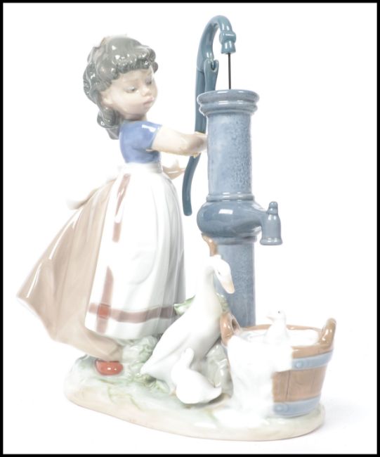 A Lladro ceramic figurine group entitled ' Summer on the Farm  ' depicting a girl with bow to hair at a water pump with duck and duckling raised on a naturalistic base. Impressed marks to base 5285. Measures: 12cm high x 13cm deep x 23cm wide.