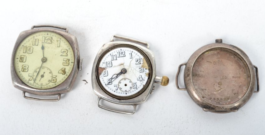 A 1930's Art Deco Jaeger style faced silver wrist watch movement and case with sub dial together with another similar in silver case, both without . Together with a silver wristwatch case without movement of similar age