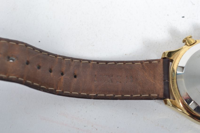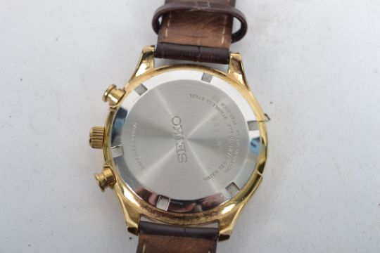 A good contemporary gents Seiko chronograph watch having sapphire crystal on  stainless steel wristwatch, case no 100505, model 6T63 - 00C0. Set to a brown leather strap