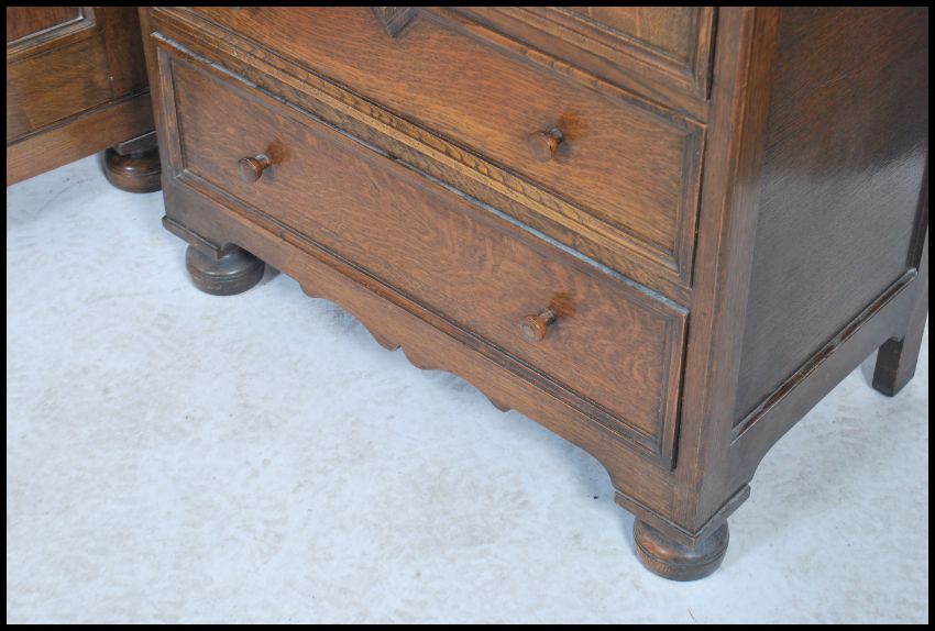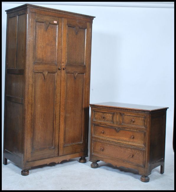 A Jacobean style bedroom suite to include a oak double wardrobe, the two panelled doors opening to reveal a fitted interior, a two over two matching chest of drawers with swing mirror atop, both large pieces raised on bun feet.