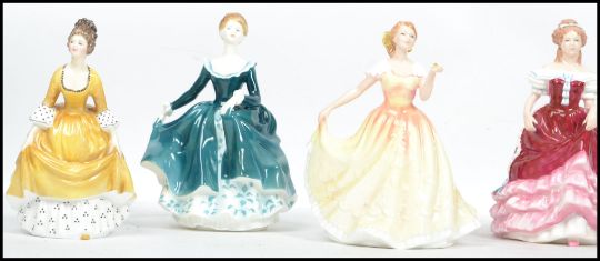 A collection of vintage Royal Doulton ceramic figures to include Sweet Sixteen HN3648, Deborah HN3644, Fair Lady Red HN2832, Coraline HN2307, Alexandra HN3286, Janine HN2461, Charlotte HN2421. Measures: 21cm highest x 14cm widest x 14cm deepest.