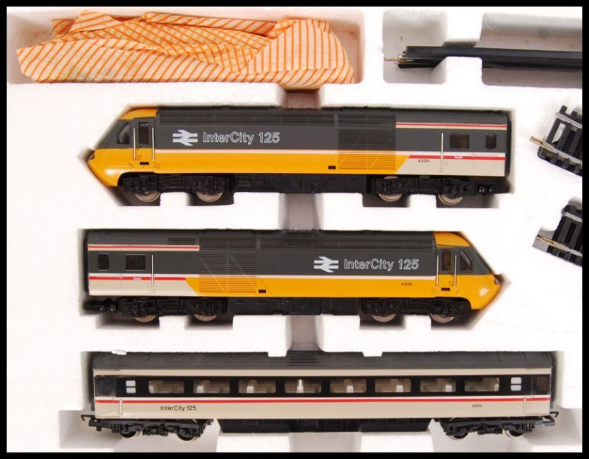 An original ' 00 ' gauge Hornby High Speed Train Set with loco & carriage. Appears complete with instruction manual. Within the original box.