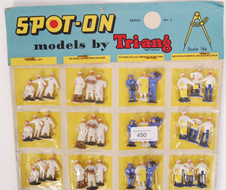 A rare and original vintage ex-shop stock dealers display counter top card for Triang Spot On ' No. 2 ' plastic model figures (for accompanying diecast models). Featuring all 24x original figures, still sealed within their blisters upon the perforated card backing. Features 4x sets of figures 'Garage Set,' 'Milkman/Laundryman/Butcher,' 'Postman/Sailor/Sandwich Board Man,' and 'Newspapermen/Roadsweeper.' Contents mint and unused, the backing with some wear and tear - some perforations have separated, edge curling etc, but the item is still together as a whole. Incredibly rare item.