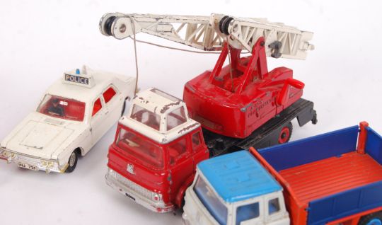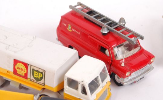 A collection of 10x assorted loose unboxed vintage Dinky diecast models. Condition varies from fair to near mint. Comprising of; Jones Fleetmaster 970 (fair), 136 Hillman Imp (fair to good), Jensen FF (fair to good), 260 Royal Mail Van (good / very good), Bedford Dropside (good), Ford Zodiac Police Car (fair to good), Fire Engine (good), Leyland Octopus (fair to good), Bedford Dropside (yellow - near mint), and Ford Transit Van Fire Service (near mint, with one axe and hose). Interesting collection.