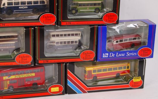 A collection of 10x assorted EFE Exclusive First Editions diecast model 1:76 scale buses. All appear mint, within the original boxes. To include; 16201, 16210, 18304, 20801DL, 27203, 27202 and others.
