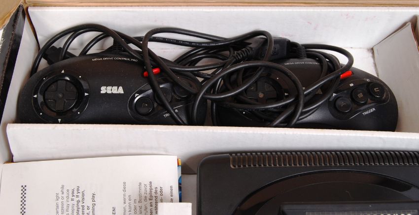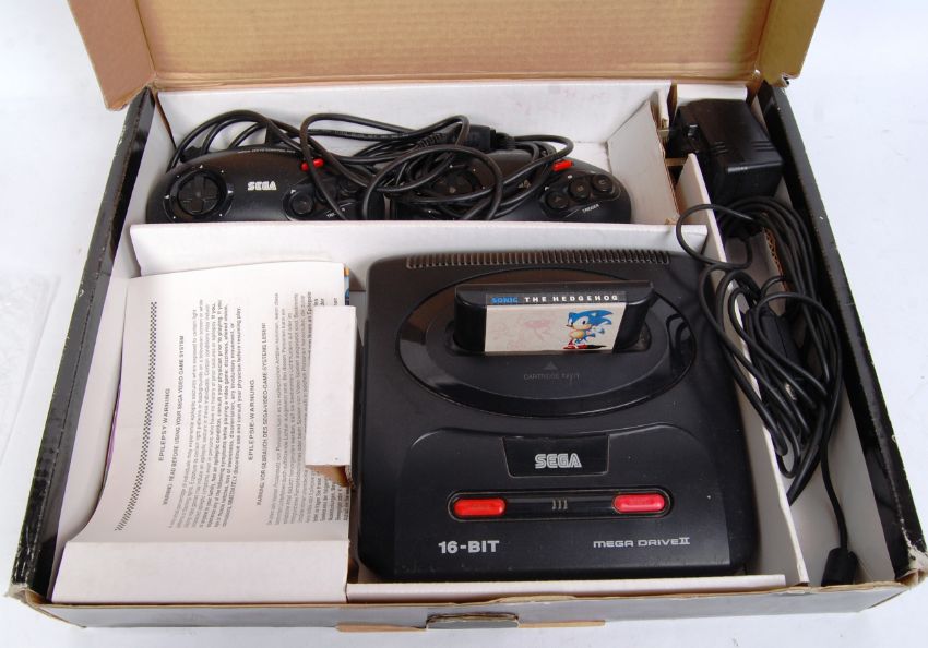 An original vintage SEGA Mega Drive II games console. ' 16 Bit ' Appears to be complete, including the ' Sonic The Hedgehog ' game cartridge, both control pads, TV lead and power adaptor. With instructions, within the original box. Vendor assures us console is in working condition, but it remains unchecked by us.