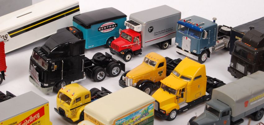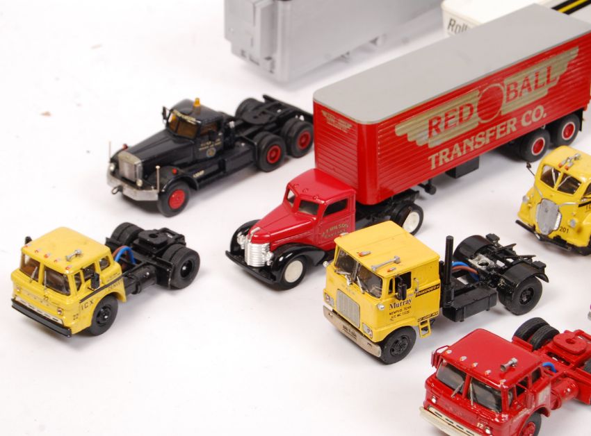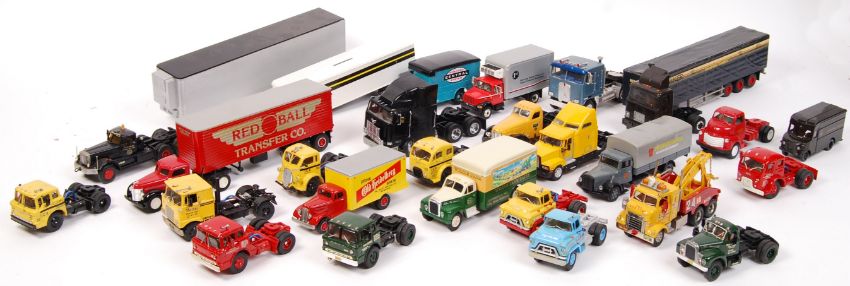A large collection of assorted truck / haulage related loose diecast models. Many appear to be of American Mack / Kenworth trucks. To include ERTL, Corgi, First Gear, and many unnamed white metal made kits / code 3 custom truck cabs (made to a high standard). Interesting and varied collection.