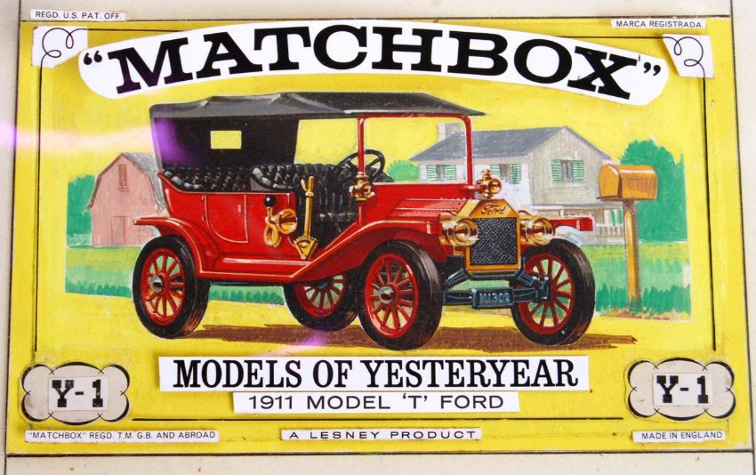 A rare original piece of box artwork for Matchbox Lesney Models Of Yesteryear diecast model Y-1 1911 Model T Ford ' New Model '. Contains a panel of artwork for the rear of the box, and details for both end flaps. Watercolour and mixed media, with text overlays. Bold bright colours. Superb and rare piece of artwork. Measures approx; 38cm x 49cm.