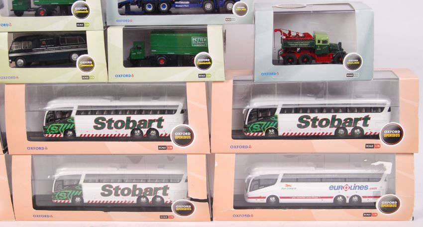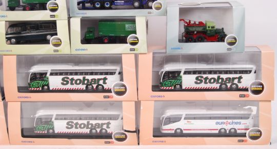 A collection of 14x Oxford Diecast 1:76 scale 00 gauge diecast model cars, haulage, omnibus and other series. All models within the original display boxes (some with cracks / torn card). To include; Eddie Stobart Coaches, Commercials, Wagons etc.