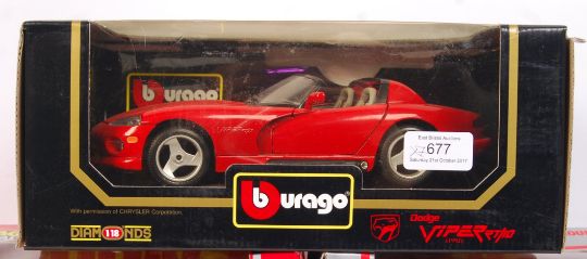 A collection of 7x Burago large scale diecast model cars. Comprising of; 6x 1:24 scale and 1x 1:18 scale. To include; Dodge Viper, Ferrari F40, Bugatti, Ferrari 250 and others. All models appear mint, within the original display boxes (some boxes with wear).