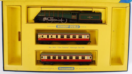 An original vintage Hornby Dublo 00 gauge railway trainset ' The Talisman 2015 '. Containing the correct two rail Golden Fleece Locomotive and Talisman carriages. Boxed, no track. Condition generally very good to near mint. Box fair.