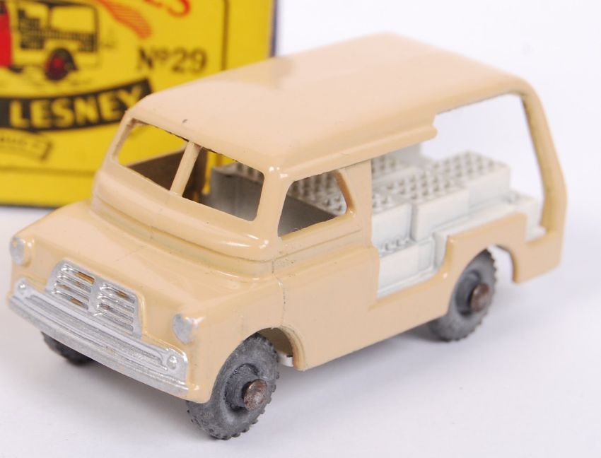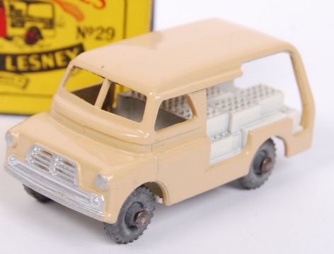 An original vintage Matchbox Moko Lesney diecast model No. 29 Bedford Milk Delivery Van. Light brown body, with white bottle load. Metal wheels. Very near mint model. Within the original box.