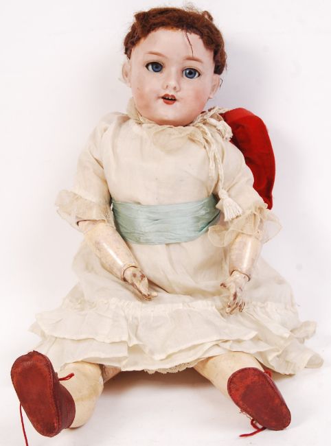 An antique 19th century A&M Armand Marseille bisque headed and composition bodied doll. Marked 'A 5 M' 390 to rear of head. Original clothing remains. With sleeping eyes, original hair and joined limbs. Measures approx; 52cm tall.