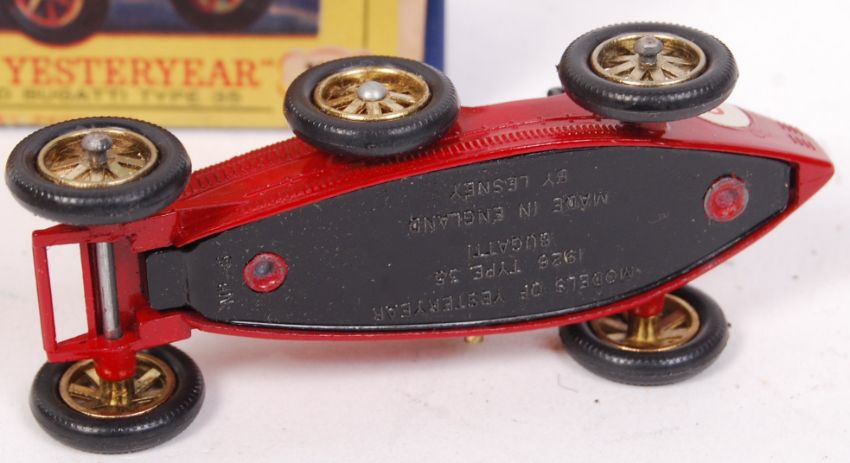 An original rare variation Matchbox Models Of Yesteryear Lesney Y-6 1926 Bugatti Type 35. Red body, No. 6 decal with rare gold radiator variation. Within the original blue variation box.
