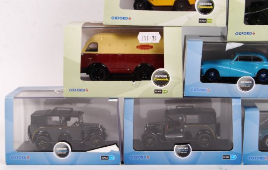 A collection of 12x Oxford Diecast 1:43 scale model cars and vans. To include Jaguar Saloon, Vauxhall Firenza, Land Rover, Southdown Ford and others. All models appear mint and unused, within the original display boxes. Including models from the ' Commericals ' range.